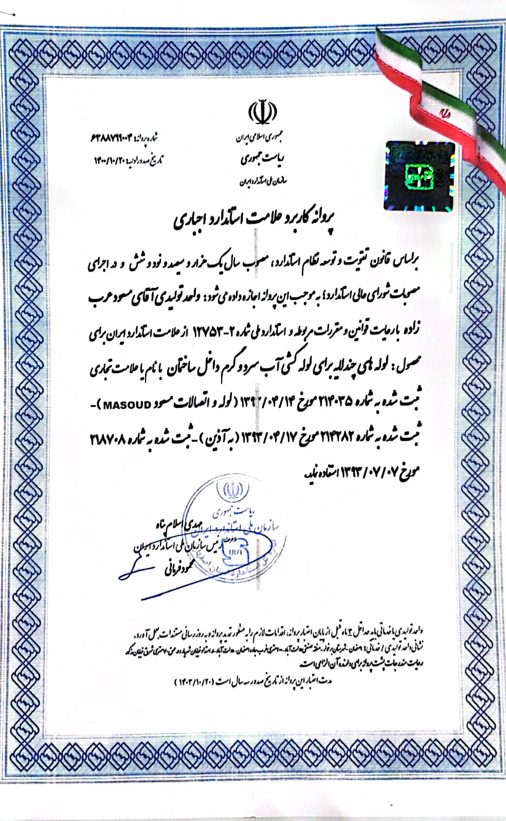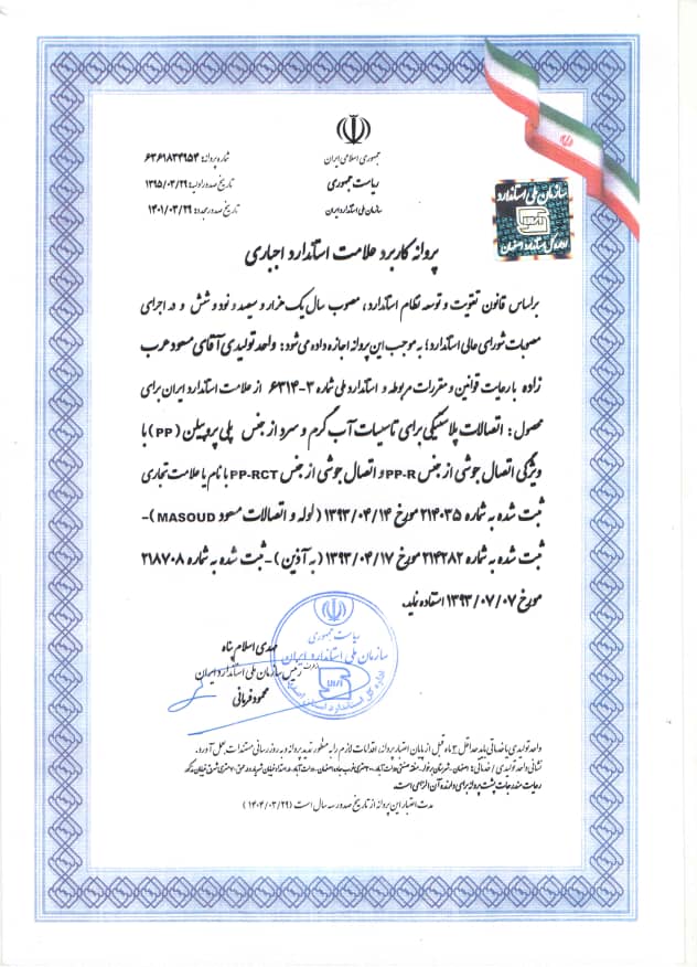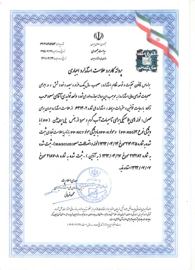 درحال حاضر لوله و اتصالات پلی پروپیلن PP-R & PPRCT و لوله های سه لایه با الیاف سیلیس ( رده های کاربری یک تا پنج ) PPRCT/PP+GF/PPRCT & PPR/PP+GF/PPR و لوله های فویل دار 5 لایه PEX/ALPEX & PEX/AL/PERT در کارخانه لوله مسعود مطابق ضوابط استاندارد ملی ایران و مرکز تحقیقات وزارت مسکن و شهرسازی تولید و به بازار عرضه می گردد.